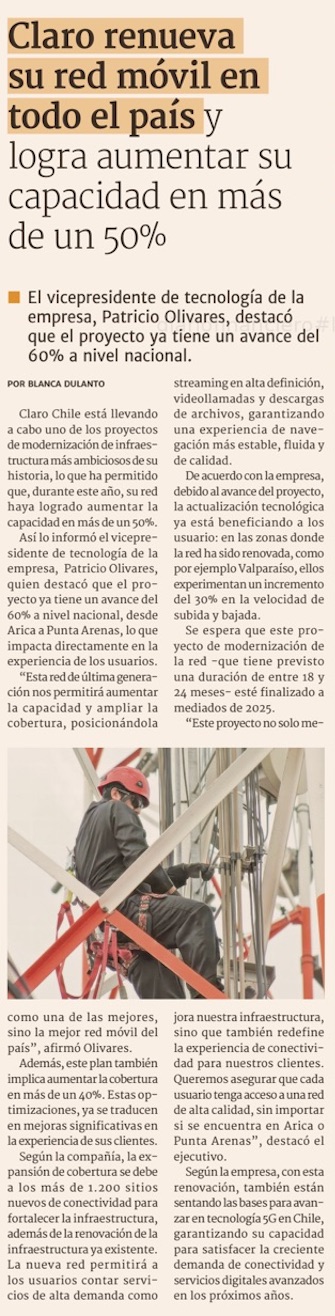 Claro Chile anuncia aumento de su capacidad de red y cobertura - (Pulso)