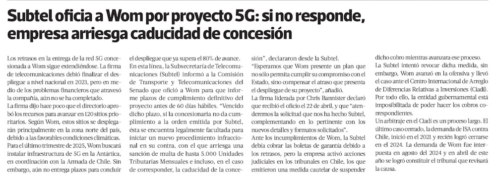 Subtel emplaza a WOM para comprometer plazos de 5G - (El Mercurio de Santiago)
