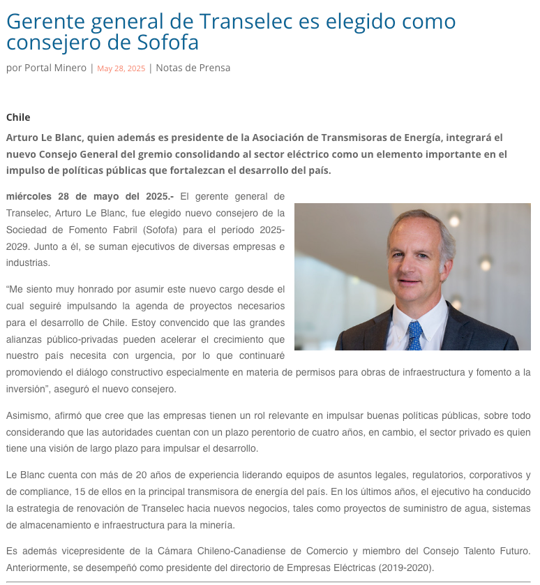 Gerente general de Transelec es elegido como consejero de Sofofa - (minerialocal.cl)
