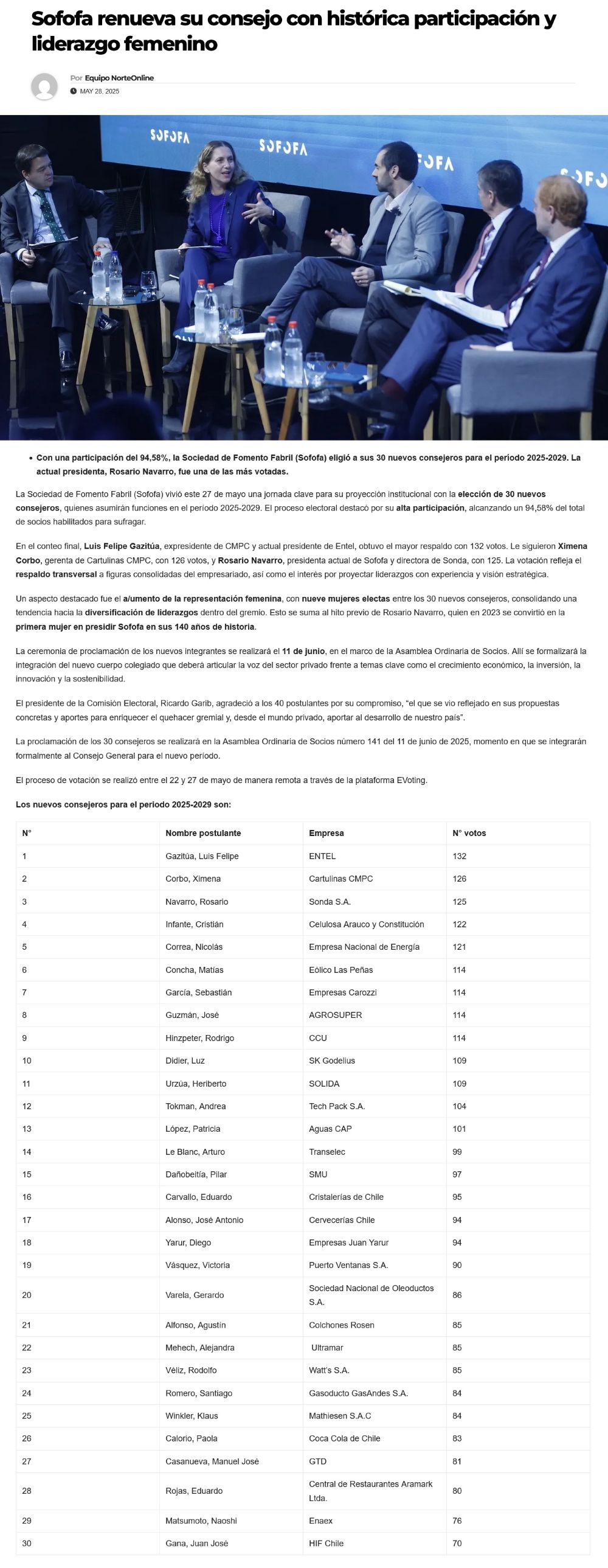 Sofofa elige a 30 nuevos Consejeros y actual presidenta del gremio queda entre los tres más votados - (biobiochile online)