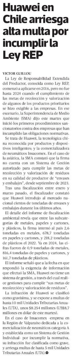 SMA acusa a Huawei de infringir la Ley REP: arriesga millonaria multa - (El Mercurio de Santiago)