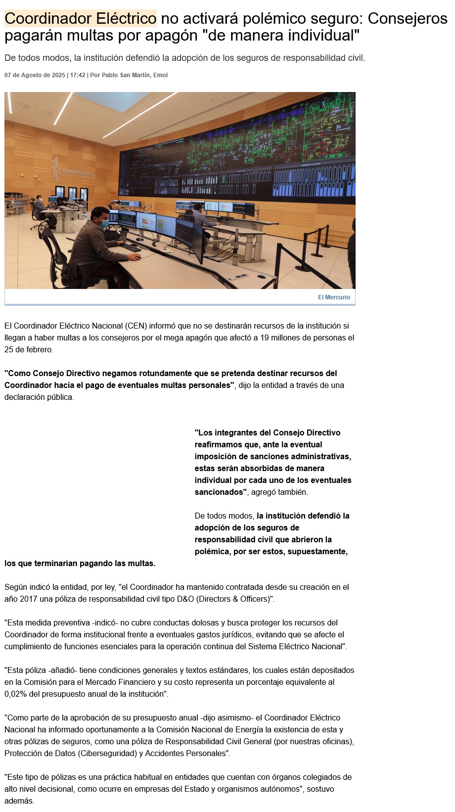 Coordinador Eléctrico niega que se usará "seguro" para pagar posibles multas por megacorte de febrero - (biobiochile online)