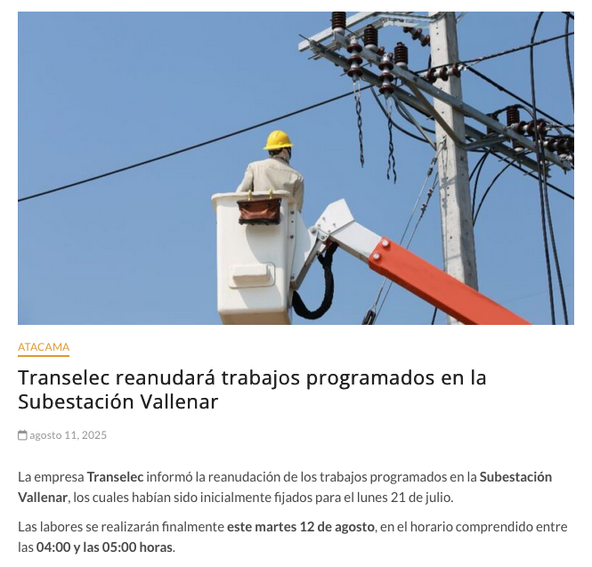 Transelec reanudará trabajos programados en la Subestación Vallenar - (elzorronortino.cl)