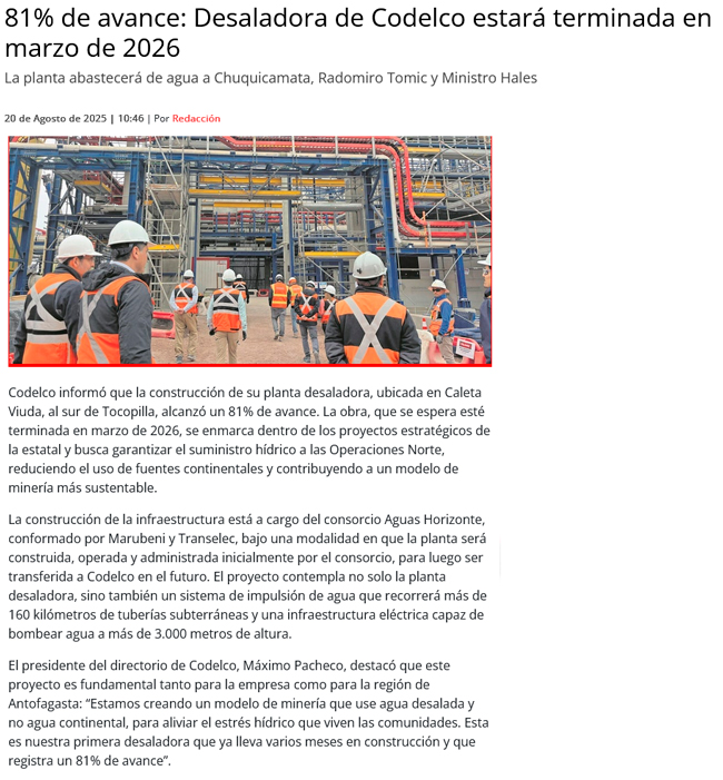 Desalinizadora de Codelco estará lista en marzo de 2026 - (El Mercurio de Santiago)