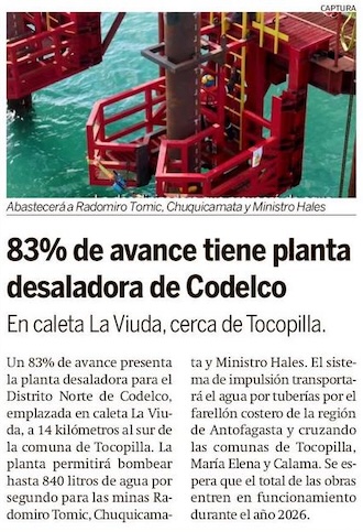 Una de las mayores obras de infraestructura hídrica para la minería latinoamericana entra en su recta final - (El Mercurio de Antofagasta)