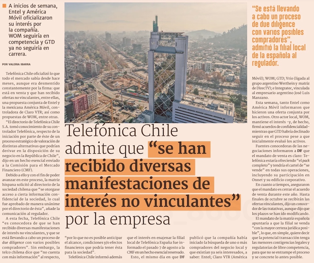 Telefónica Chile confirma proceso de venta: inicia due diligence con varios posibles compradores - (El Mercurio de Santiago)