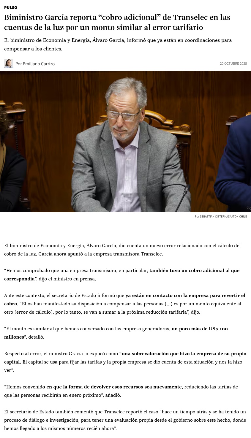 Ministro Álvaro García informó que empresa de transmisión Transelec recaudó por error más de US$100 millones - (CIPER Chile)