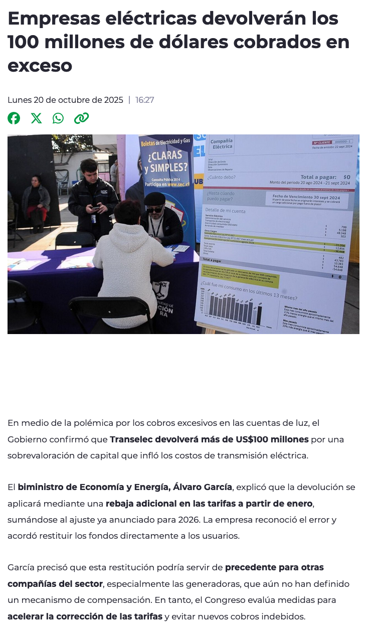 Empresas eléctricas devolverán los 100 millones de dólares cobrados en exceso - (radioua.cl)