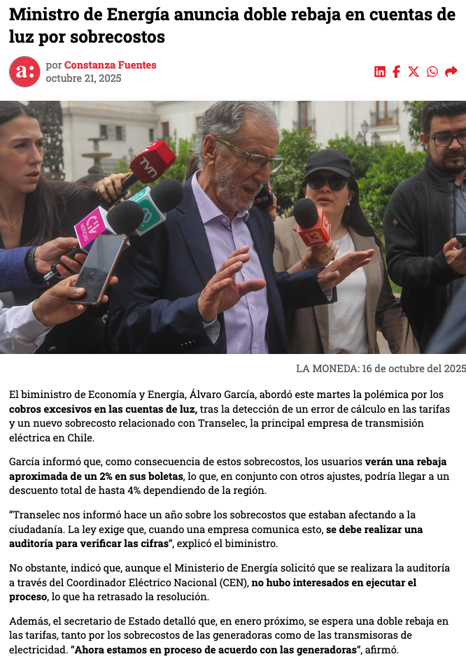 Gobierno confirma acuerdo con Transelec sobre devolución de cobros en exceso a clientes a través de rebajas en cuentas de luz - (puranoticia.cl)