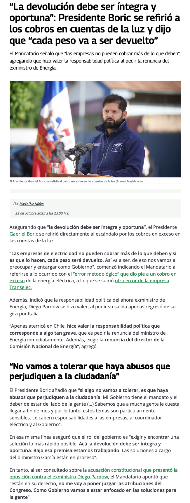 "Cada peso será devuelto": Boric promete una solución "lo más breve posible" al error de cobro en las cuentas de luz - (meganoticias.cl)