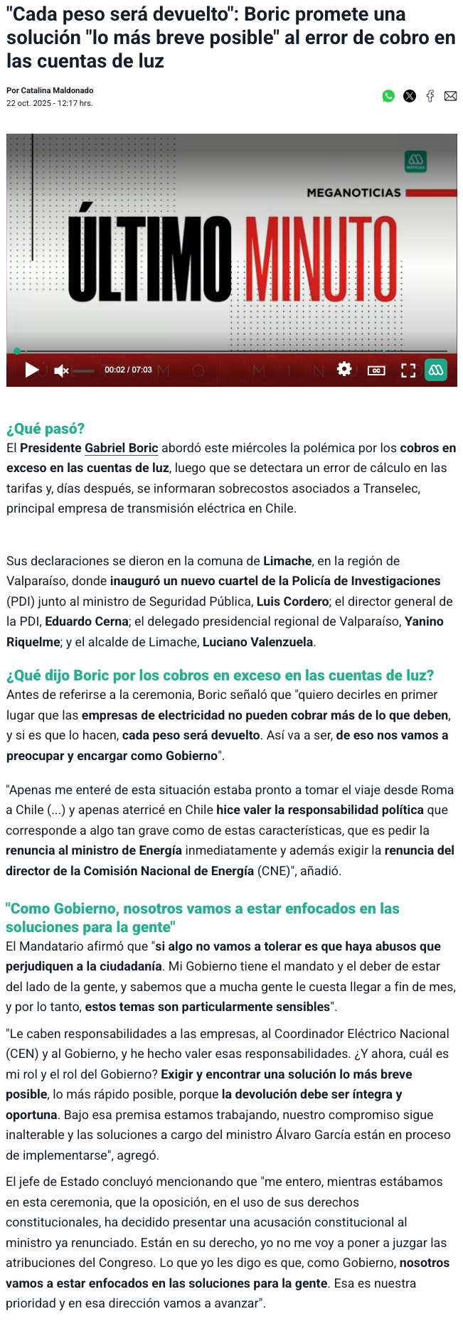 “La devolución debe ser íntegra y oportuna”: Presidente Boric se refirió a los cobros en cuentas de la luz y dijo que “cada peso va a ser devuelto” - (publimetro.cl)