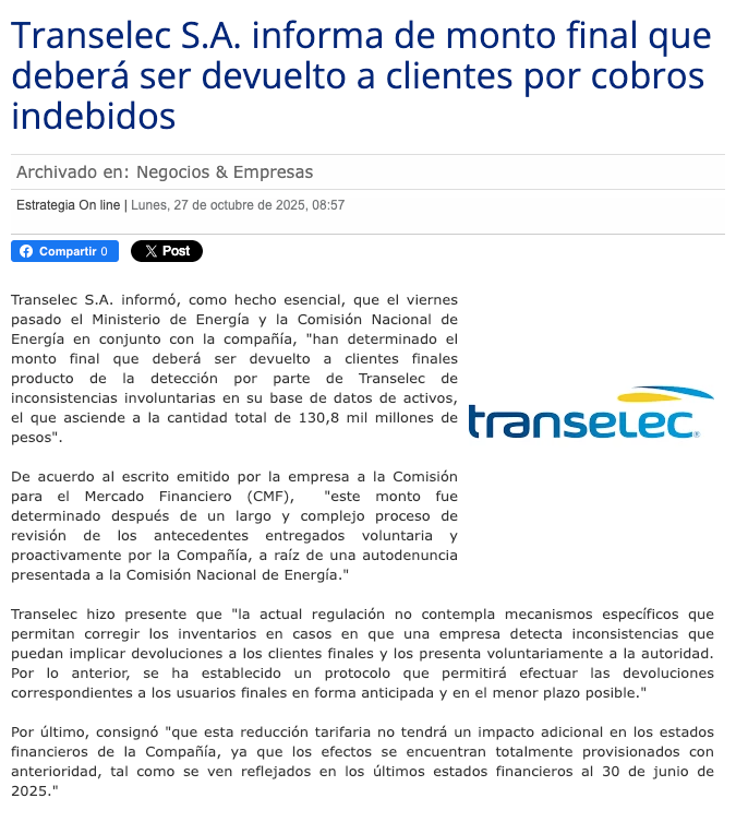 Transelec devolverá $135 millones de dólares a partir de enero 2026 - (elconquistadorconcepcion.cl)