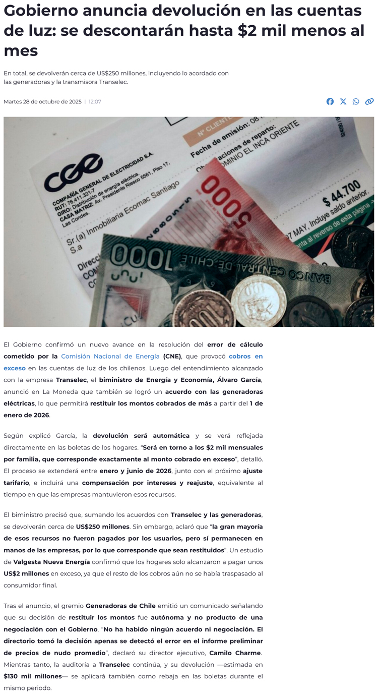 Gobierno confirma que las cuentas de luz bajarán cerca de $2.000 mensuales desde enero de 2026 - (radioamigavallenar.cl)