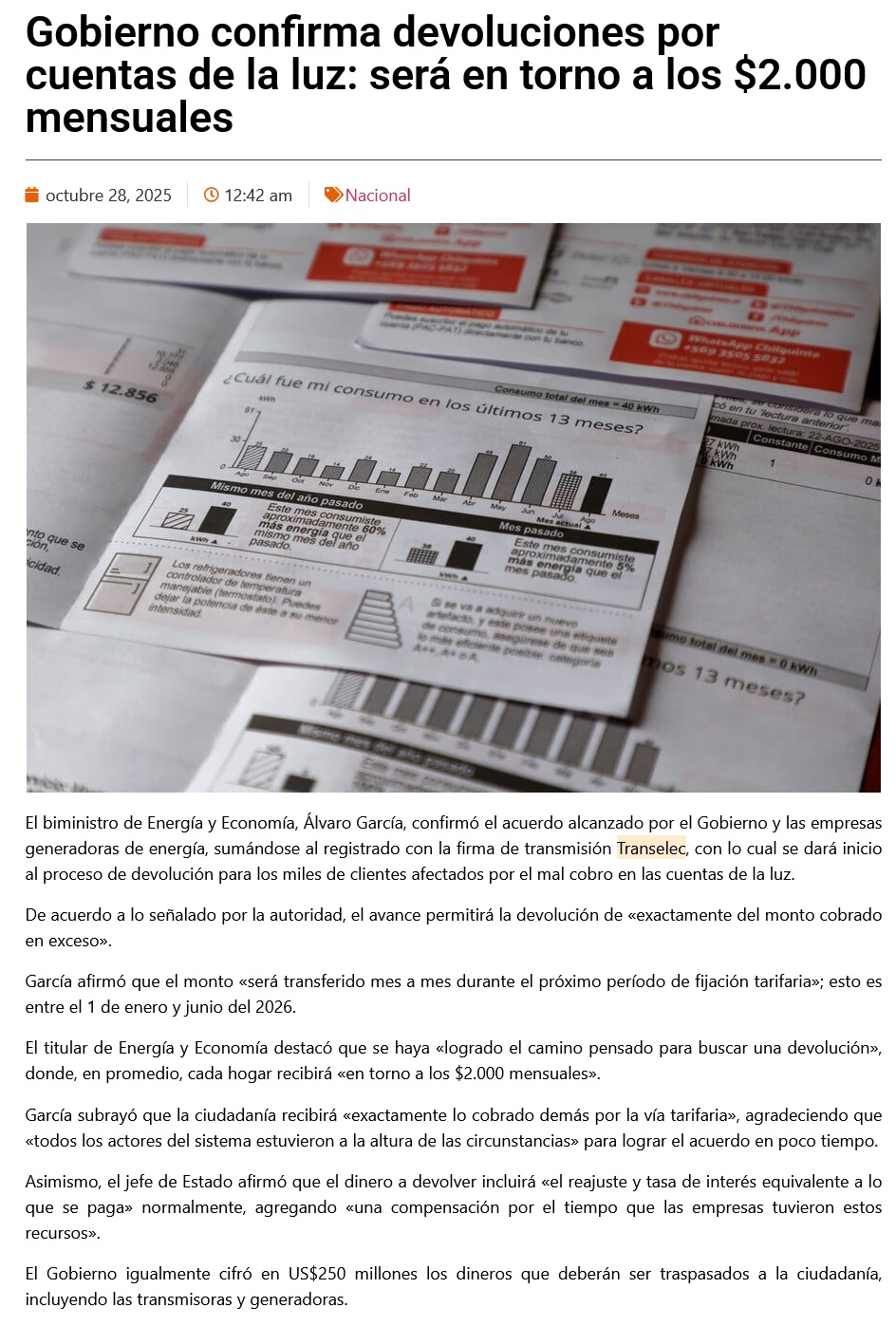 “$2 mil al mes”: Gobierno confirma cuánto bajarán las cuentas de luz - (El Día)