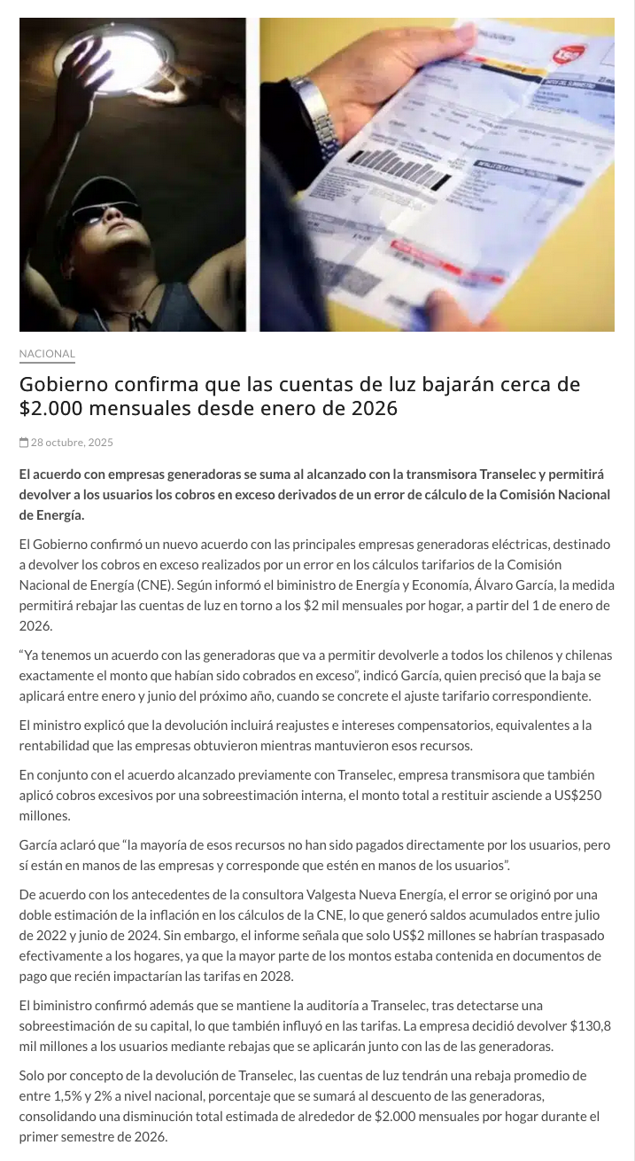 Gobierno confirma devoluciones por cuentas de la luz: será en torno a los $2.000 mensuales - (elzorronortino.cl)