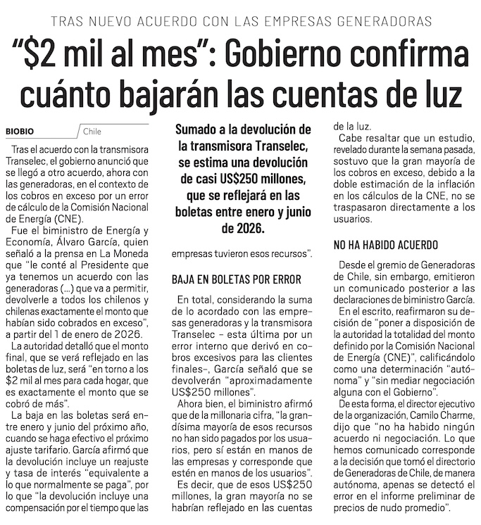 Gobierno confirma que las cuentas de luz bajarán cerca de $2.000 mensuales desde enero de 2026 - (radioamigavallenar.cl)