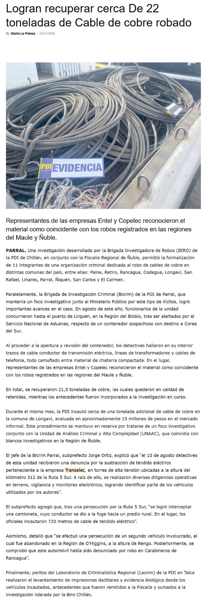 Logran recuperar cerca De 22 toneladas de Cable de cobre robado - (new.diariolaprensa.cl)
