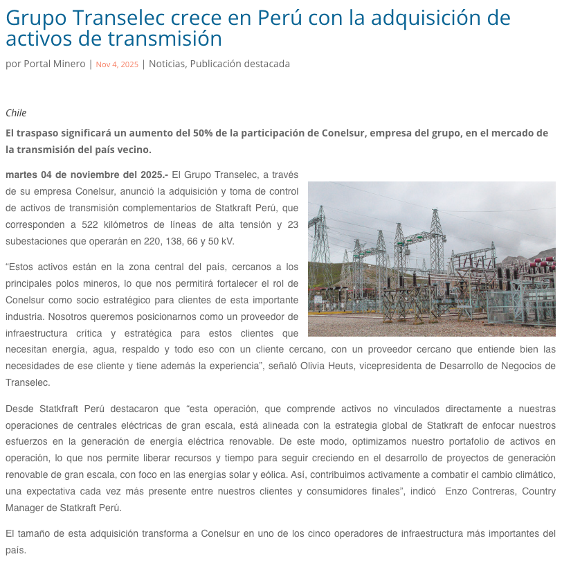 Grupo Transelec crece en Perú con la adquisición de activos de transmisión - (mvcomunicaciones.cl)