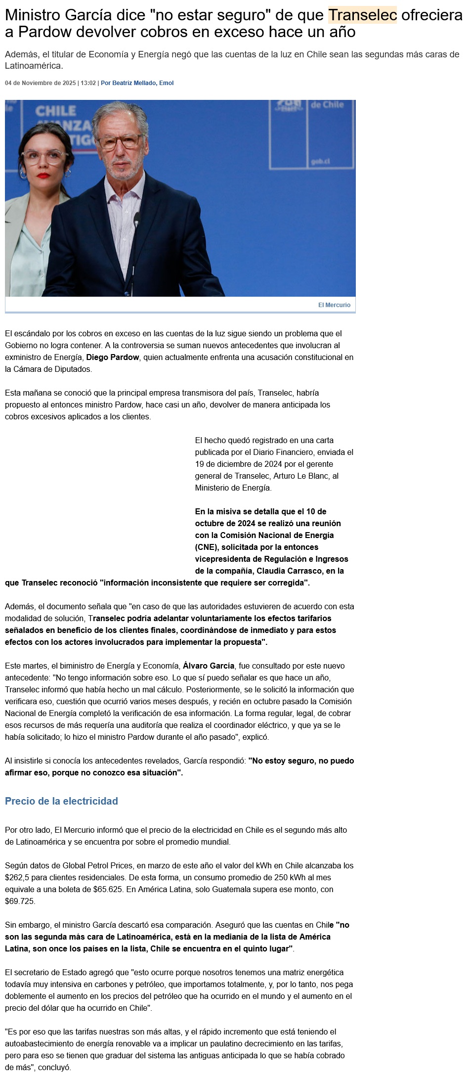 García y oferta de Transelec a Pardow de devolver cobros en exceso hace un año: “No puedo afirmar eso” - (soychile)