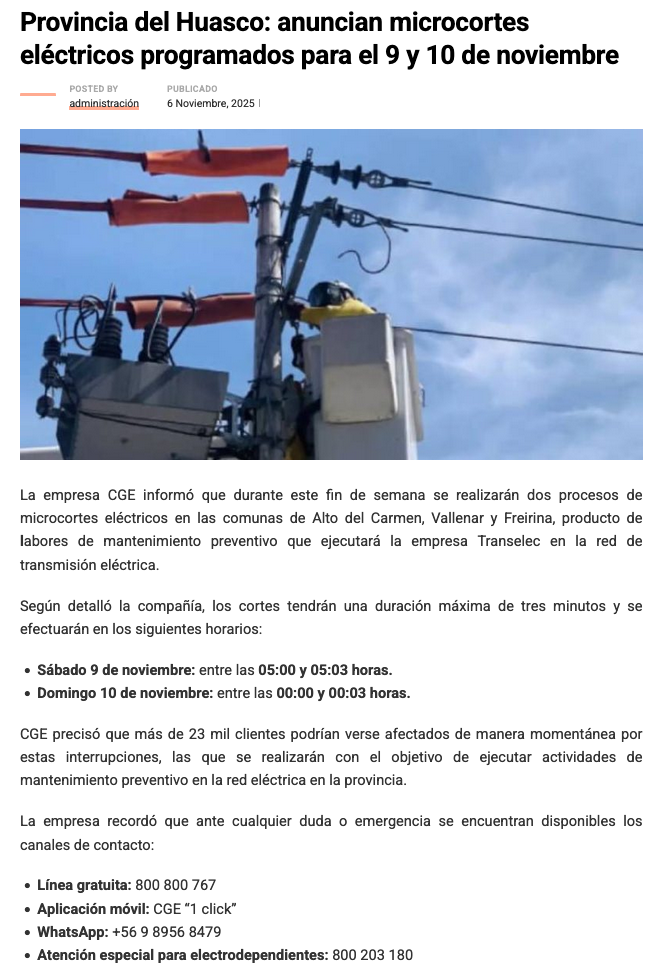 Anuncian microcortes programados en tres comunas de la Provincia del Huasco - (elzorronortino.cl)