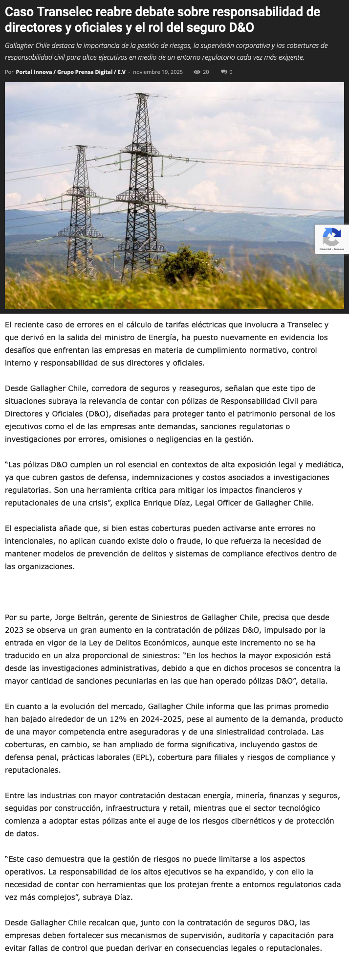 Caso Transelec reabre debate sobre responsabilidad de directores y oficiales y el rol del seguro D&O - (g5noticias.cl)