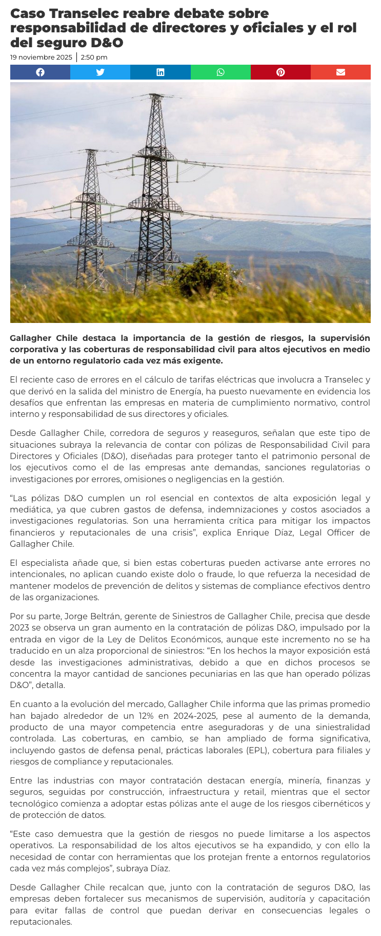 Caso Transelec reabre debate sobre responsabilidad de directores y oficiales y el rol del seguro D&O - (portalinnova.cl)