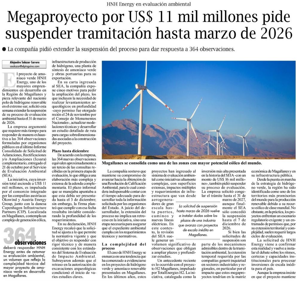 SEA suspende hasta marzo trámite de megaproyecto en Magallanes por US$ 11 mil millones - (Diario Financiero)
