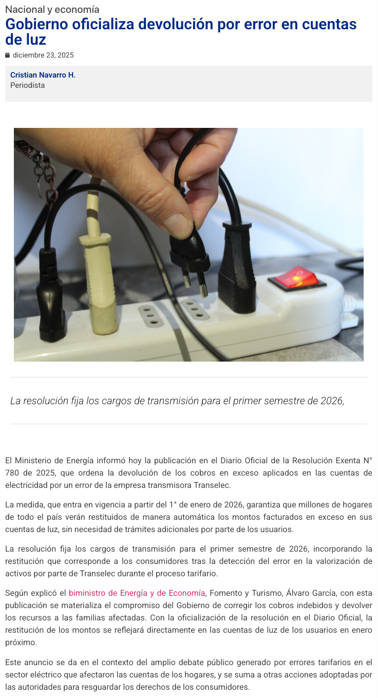 Gobierno publica resolución que establece devolución de cobros en exceso en cuentas de la luz por error de Transelec - (puranoticia.cl)