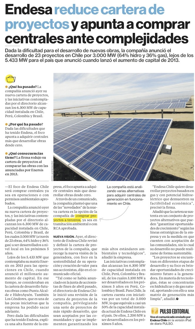 Endesa prevé instalar tres mil MW en Chile, pero no especifica proyectos - (El Mercurio de Santiago)