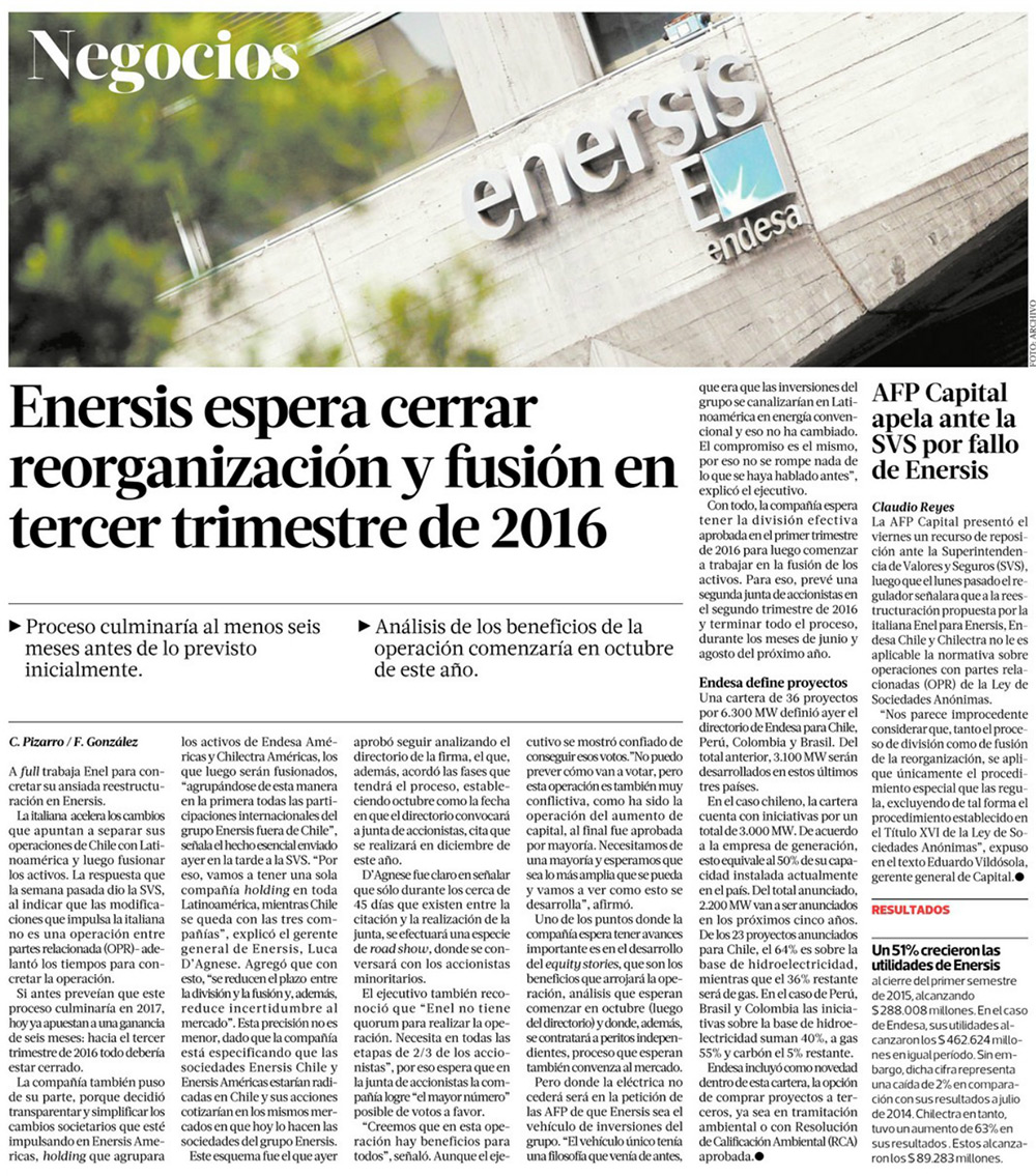 Enersis prevé que reorganización estará completa en tercer trimestre de 2016 - (Estrategia)